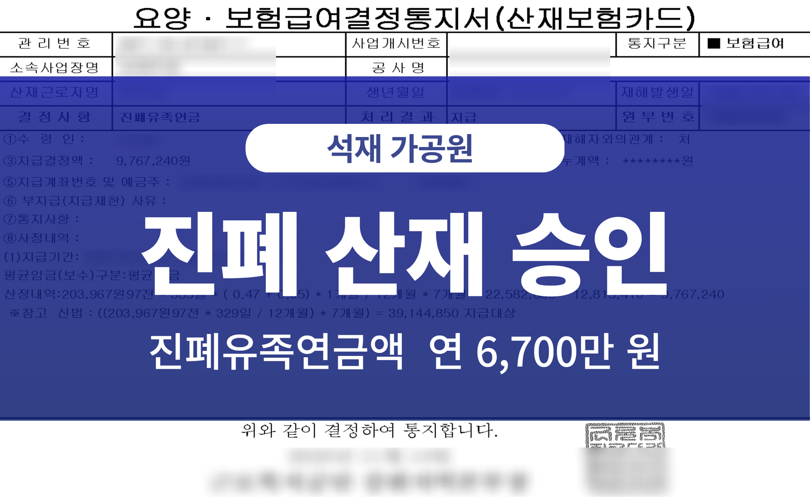 진폐로 인한 사망이 인정되어 진폐유족보상 청구를 승인받게 되었습니다.